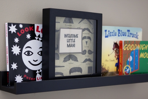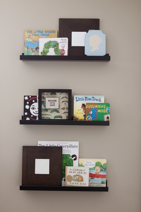This wall is right next to the changing station. The picture shelves are from Ikea along with the wood mirrors. The little man frame and silhouette plaque were made by good friends.