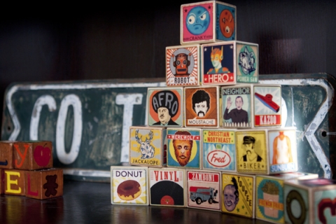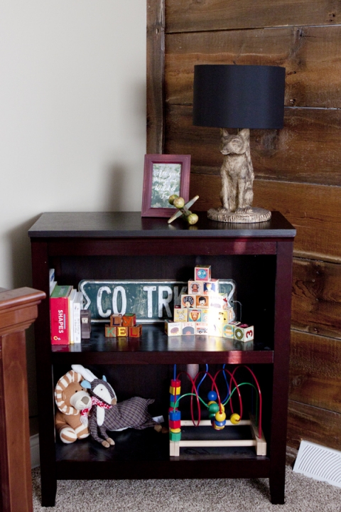 Also on the same bookshelf (from Target) are blocks from Amazon, handmade blocks by my Aunt from when I was a baby, and the county sign which I got at an antique store in Milwaukee.