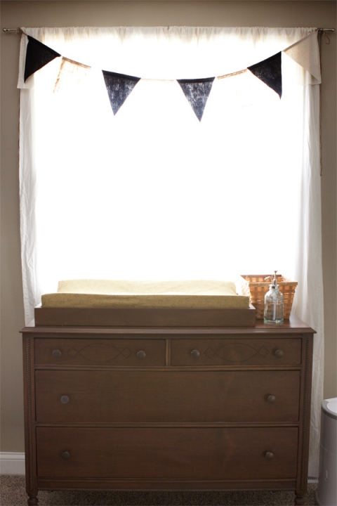 The curtains were made from the muslin table cloths at my baby shower. The bunting banners were also from my shower which my mom and sister originally made.