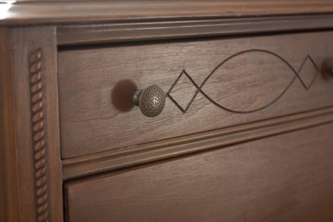 On the other side of the room is the changing station. I got the dresser from a local antique store for $100. D made the changing pad holder from this pattern and my mom made the fitted cover for it which matches the crib skirt. The dispenser is from Target and is filled with hand sanitizer. The drawers of the dresser are filled with diaper-changing essentials.