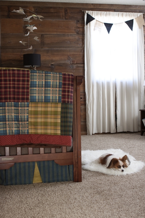 Oh the quilt. My mom made it and I’m in love with how it turned out but it was sort-of a nightmare at first. I had bought all these muted stripes and plaids that were going to be the quilt and bedding but after stressing about it for some time, it just wasn’t what I pictured. I knew I wanted some pops of color. So we started over, took a second trip to Cannon Falls and bought the blue plaid, blue stripes, red plaid, and the red trim. We were going to do a traditional quilt pattern but it still wasn’t looking right. So we went to yet ANOTHER fabric store and got the green plaid and navy plaid. Then we changed the design to be simpler and more modern – just 12 inch squares next to each other with trim around the whole thing. The inside of it is a cozy brown fleece.
