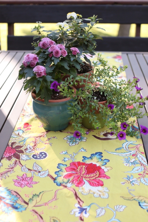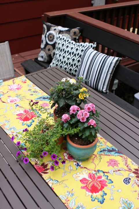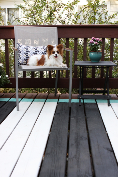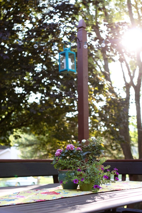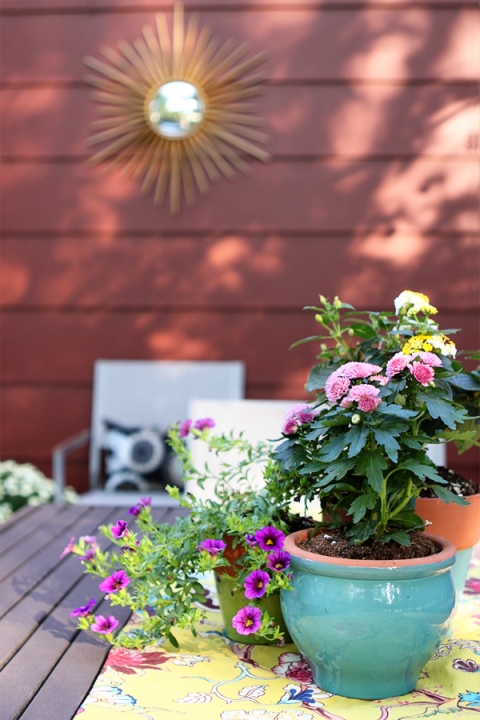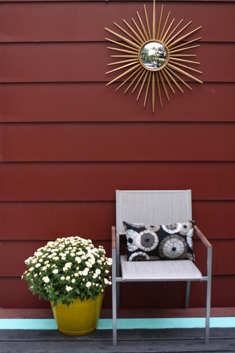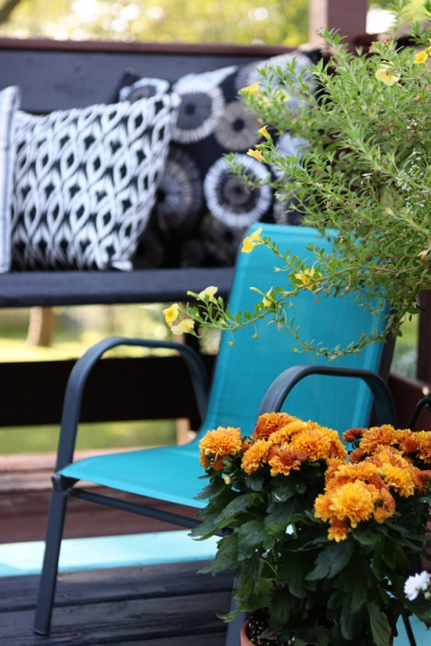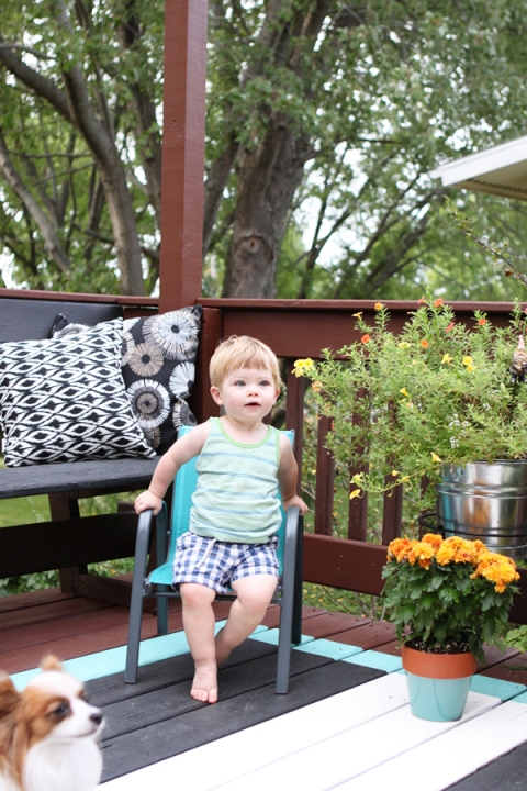 I seriously love this. The monochromatic paint on the deck is so great against the pops of color you chose. The aqua works so well but is so unexpected; everything goes together perfectly. Your flowers even add to the joy of the color scheme. You have such a great, fun eye for detail. Of course I melted like butter when I saw your tiny chair for Jack. I so need to get one for little Emmett. We have a traditional (read: boring) set up right now on the patio, but we have a chimenea and I am stoked to start using it in the coming fall weeks.