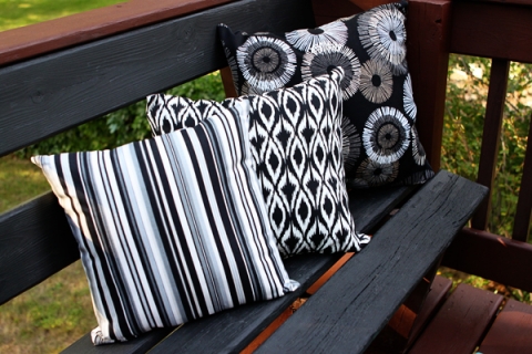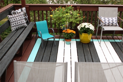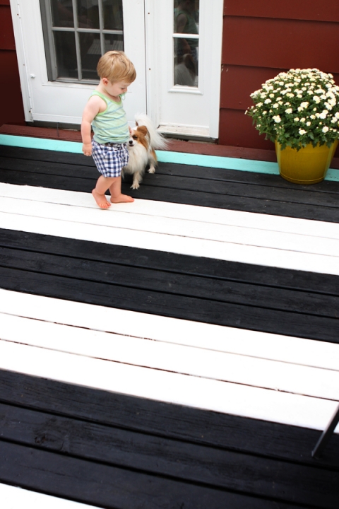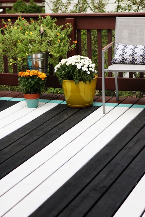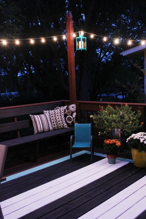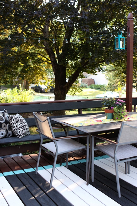Our existing deck looked pretty rough when we first bought the house. I imagine it’s been there since the house was built in 1971 and it looked like it! However, a whole new deck wasn’t in the budget. Enter paint. I had been seeing some cool painted patio floors lately so I got inspired to paint ours. And the good thing about an old deck is not being scared to try something bold. I decided to go with black and white stripes with a teal border to make it look like a rug. First my Dad pressure-washed it to make sure the paint would stick well. Then we used porch paint for the floor which seems to hold up really well. After the floor was done, D added some posts to either side of the deck so I could hang some lanterns and string lighting. I love how it adds to the whole ambiance at night. We got a solid deck stain that matched the existing color to paint the posts and the rest of the floor and sides. (I didn’t have paint the outside of the deck luckily.) And I decided to paint the bench black to go with the floor. We definitely owe a big thank you to my parents for helping with the hard labor stuff!